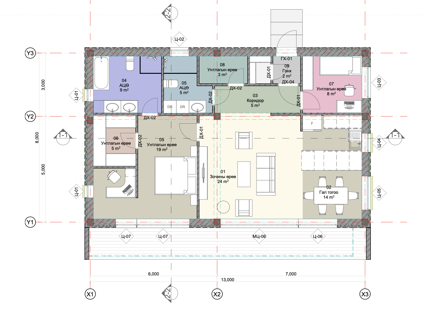 Байшингийн онцлог: Орчин үеийн хэв шинжийг агуулсан цэлгэр уужим өрөө, нэгэн хэвийн цонхны хэв шинжээс татгалзсан саруулхан том цонхнуудтай байхаар хийсэн.